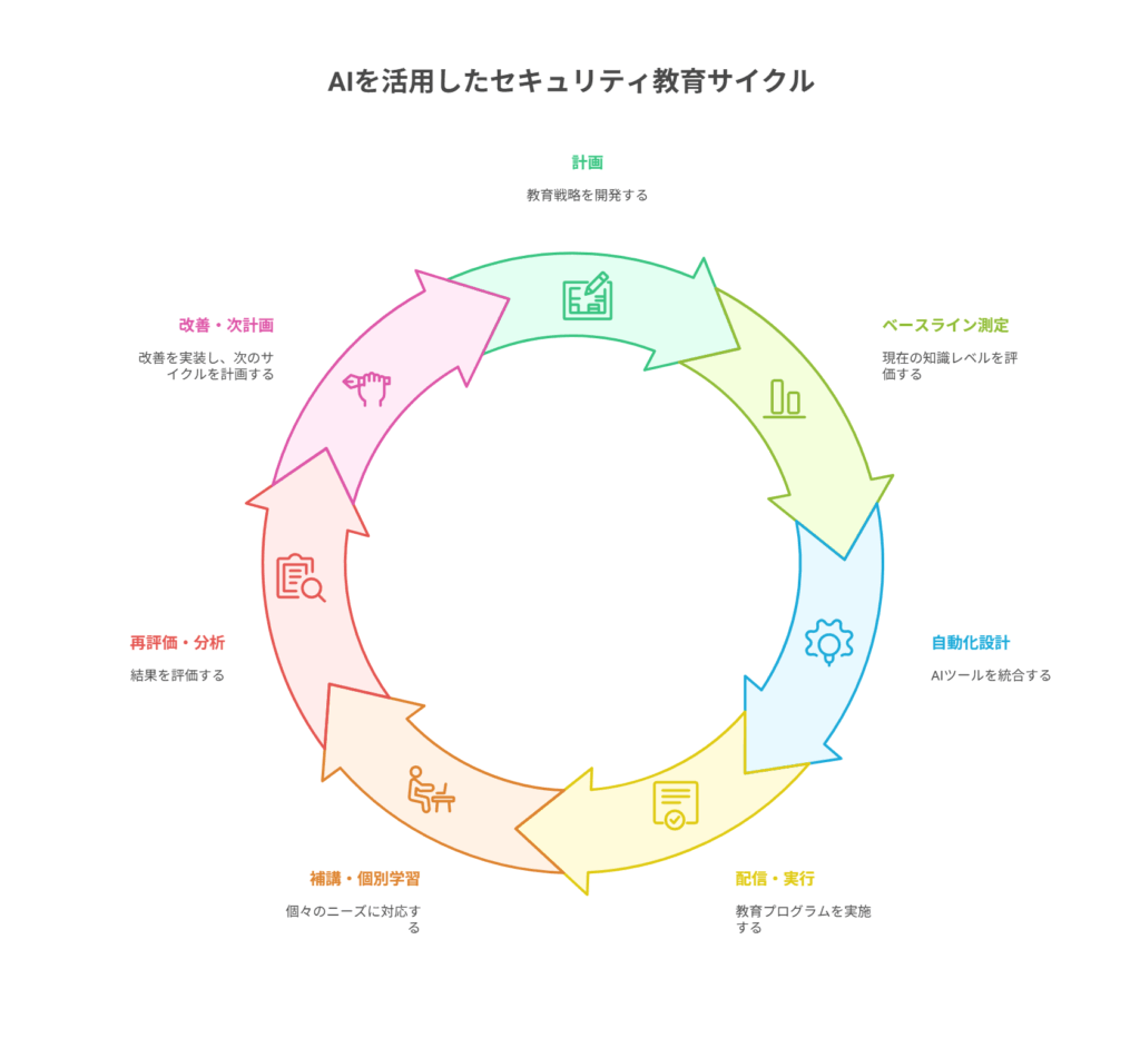 - 成功の鍵は「継続性×自動化×可視化」: 単発研修では効果は限定的。AIを活用し「訓練→行動検知→補講割当→再評価」のループを自動で回し続けることが最も重要です。