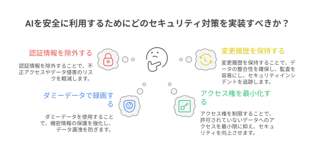 - ID、パスワード、APIキー、秘密鍵、顧客の個人情報、未公開の財務情報などは、絶対にAIサービスにインプットしてはいけません。すべてマスキングするか、ダミーの値に置き換えてください。