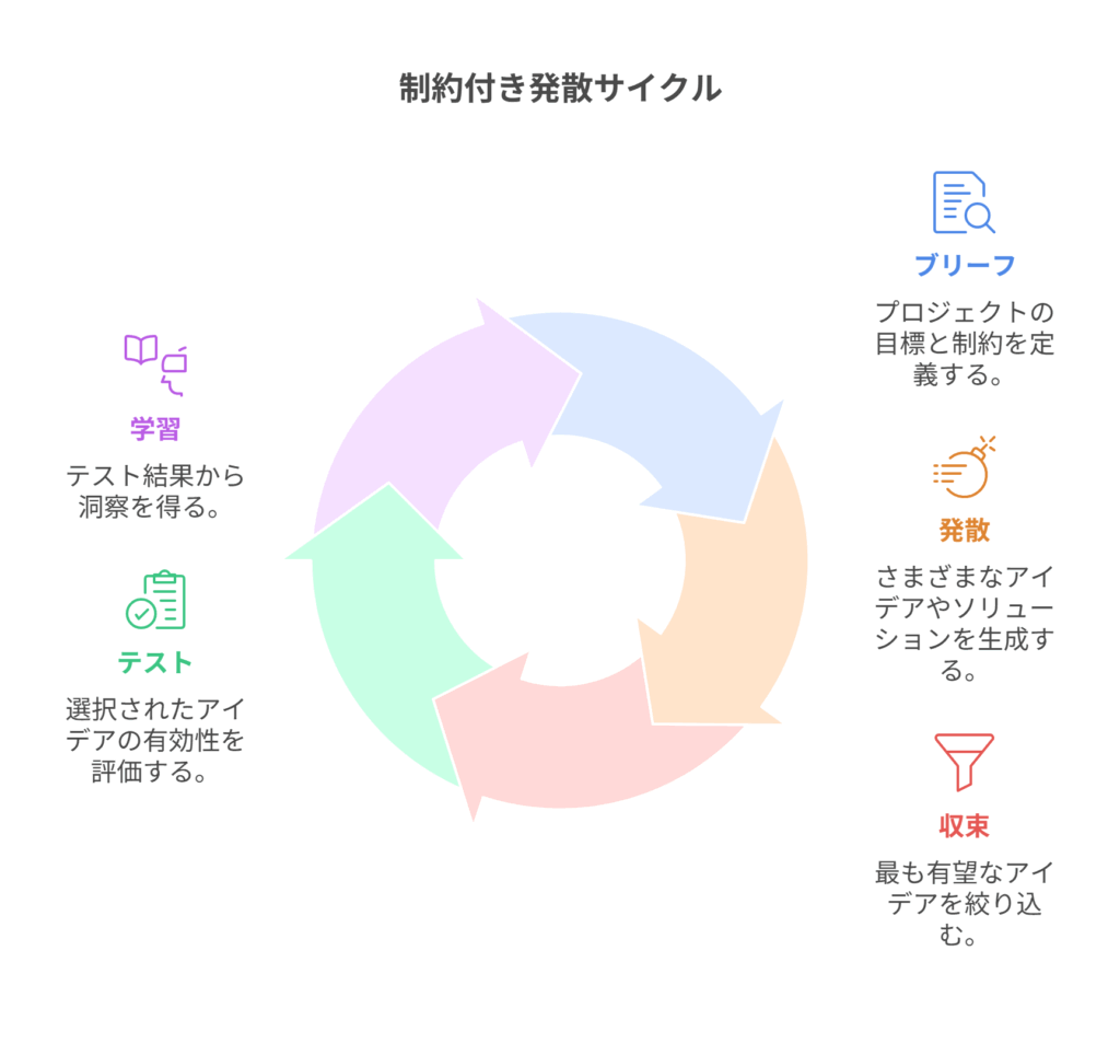 - アイデアの発散(AI): 設定された制約の中で、AIが人間には思いつかないような多様なアイデアを、短時間で大量に生成(発散)します。