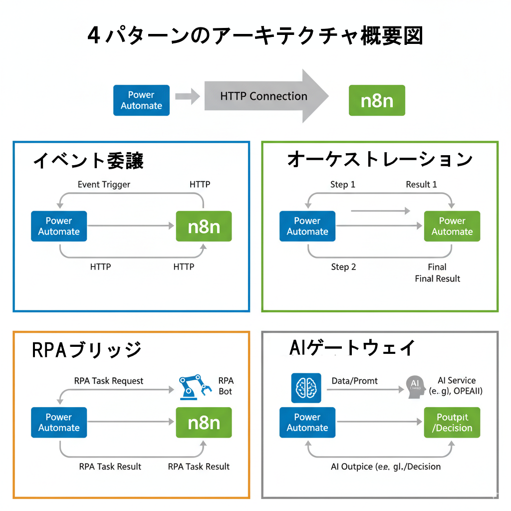 - 連携の要: 両者はHTTPリクエストで接続します。Power Automateがトリガーとなり、n8nのWebhookを呼び出して重い処理を委譲するのが基本パターンです。