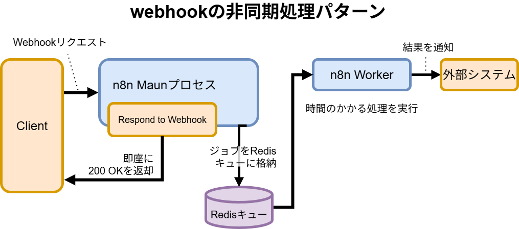 このモードこそが、本番運用のためのアーキテクチャです。Redisをジョブキュー(タスクの待合室)として利用し、役割を分離します。- メインプロセス: UIの提供、Webhookの受付、ワークフローのスケジュール登録など、軽量なタスクを担当します。Webhookを受け付けると、実行すべきジョブをRedisのキューに登録するだけですぐに応答します。