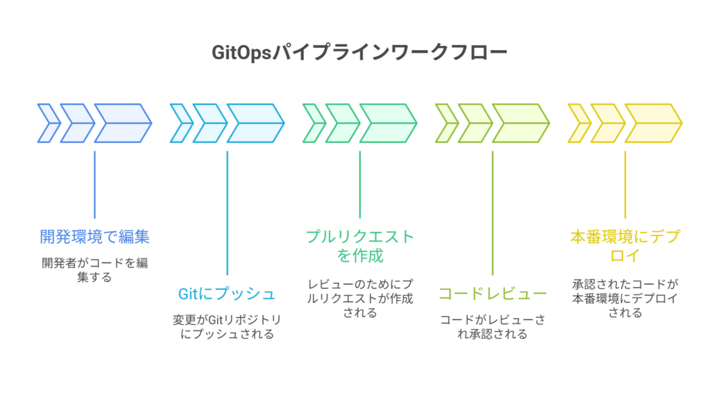 - マージと自動デプロイ: PRが承認されてメインブランチにマージされると、CI/CDパイプライン(GitHub Actions, GitLab CIなど)がトリガーされます。