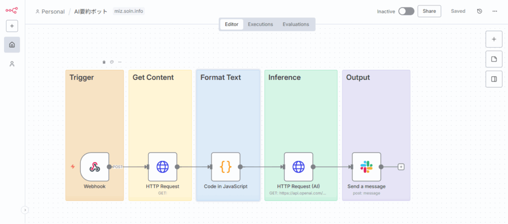 理論を学んだところで、早速手を動かしてみましょう。最初のステップとして、指定されたURLのウェブページをAIが要約し、その結果をSlackに投稿する「AI要約ボット」を作成します。これはn8n×AI自動化の最も基本的なパターンです。