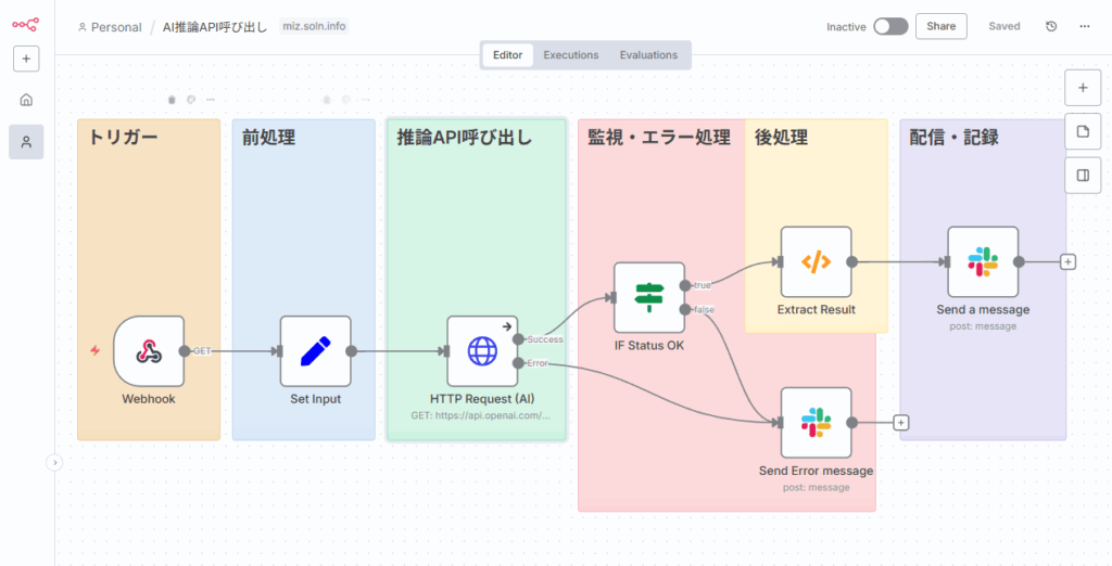 - 最小構成は4点セットから: まずは「トリガー(Webhook/スケジュール) → AI呼び出し(HTTP Request) → データ整形(Function) → 出力(Slack/メール等)」の基本形をマスターすることが成功への近道です。