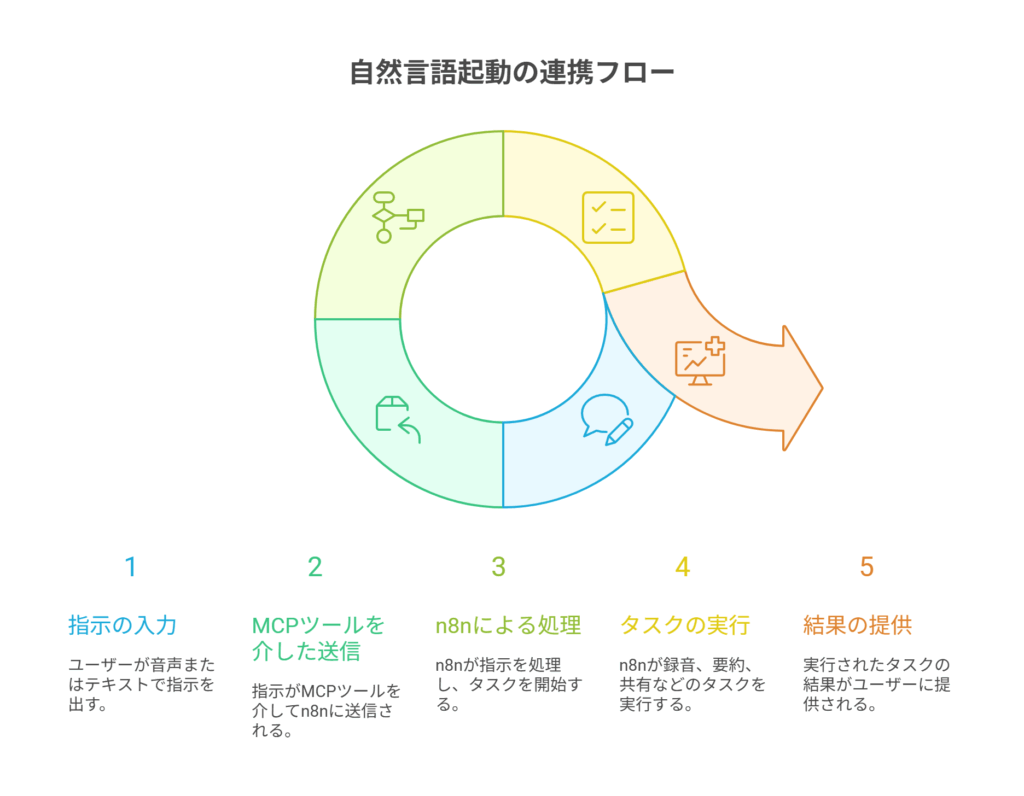 - 自然言語での起動も実現可能: MCP(Model Context Protocol)に対応したデスクトップAIクライアントと連携すれば、「会議を開始」といった自然言語の指示でn8nのWebhookを叩き、議事録生成から配信までを全自動化できます。